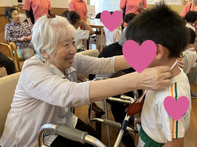 最後に、素敵な歌とダンスのお礼に利用者さんから園児達へ手作りのメダルを