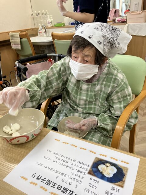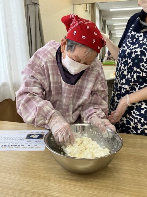 粉をこねるところから丸める作業まで、手先を使いながら「昔はよもぎ団子をよう作ったわ」「このくらいの大きさか?」と会話も弾み、なごやかな時間となりました😊