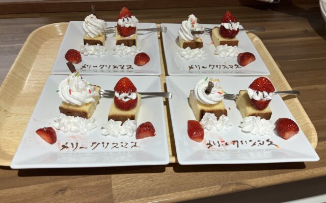 カステラの上に飾り付けて、ツリーに見立てる🎄イチゴでサンタさんを作る🎅