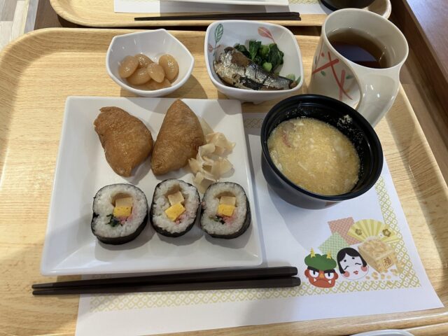 昼食にはのり巻きとおいなりさん、イワシの煮つけと白豆。
