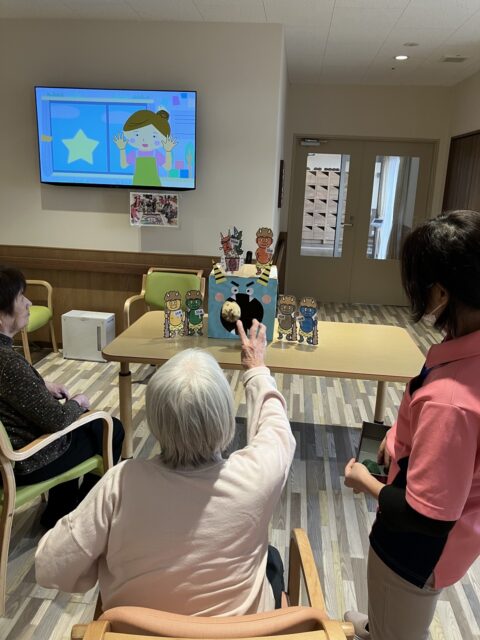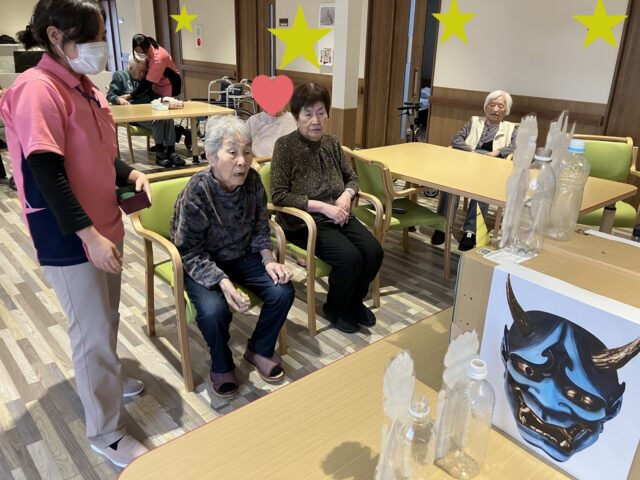 昼食後のレクレーションでは豆まき(的当て?)で体を動かします。