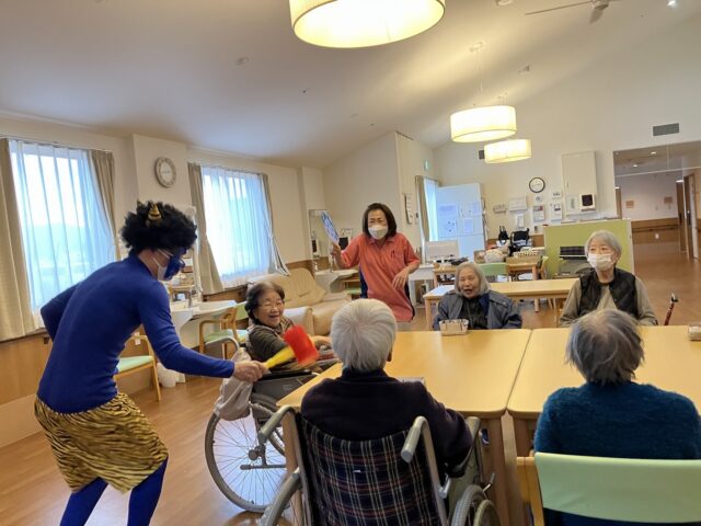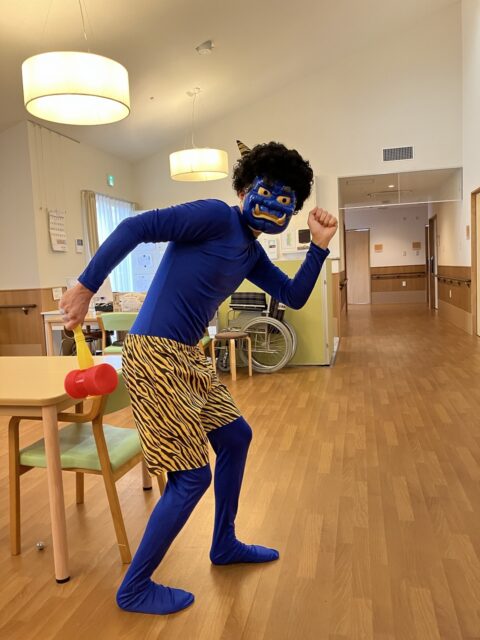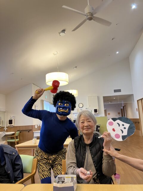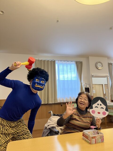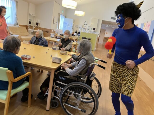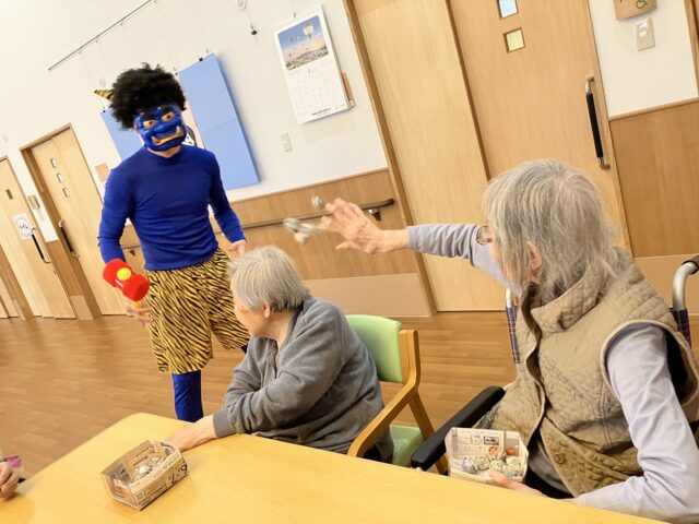 でも、職員の声かけで直ぐにわかって下さり、にぎやかに「豆まき」が始まりました😄