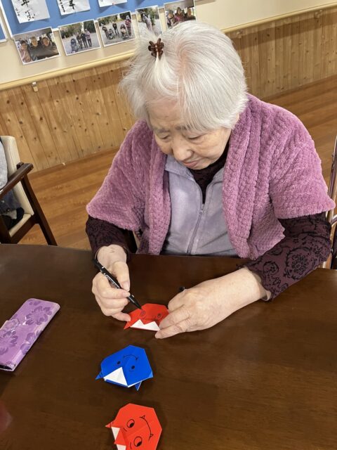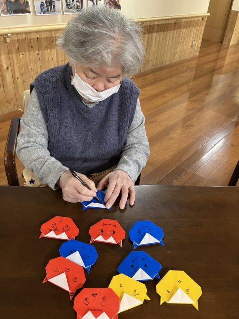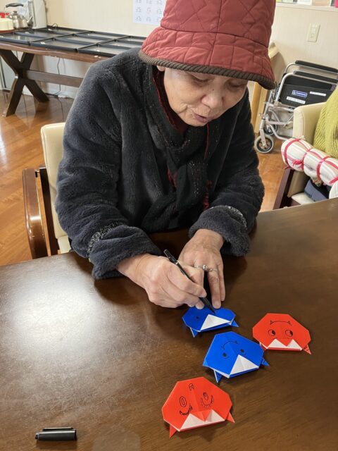 2月は節分行事があるので、それにちなんで鬼の顔を書いたり、まだまだ雪の日もありそうなので雪だるまに顔を書いたり、冬に綺麗に咲く椿を花紙で作ったりと。。。