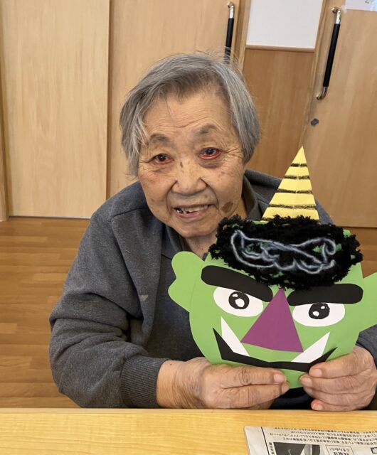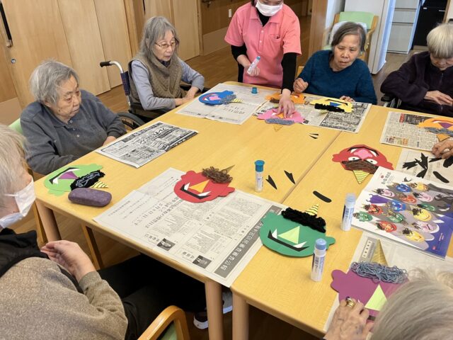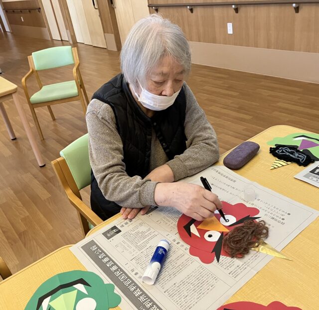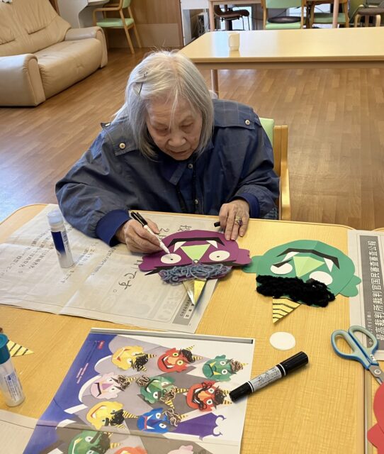 あらかじめ大まかな所は前もって作っておき、2月3日、節分の日に、色々な色の鬼をそれぞれ好みで選んでいただき、目、口、鼻などのパーツを貼って頂き、表情を作って頂きました。