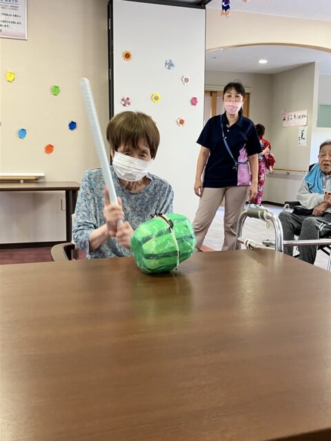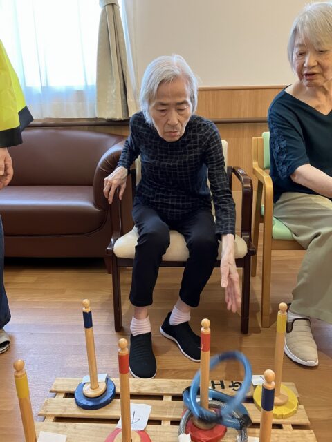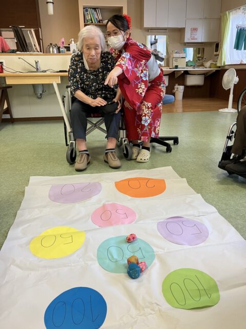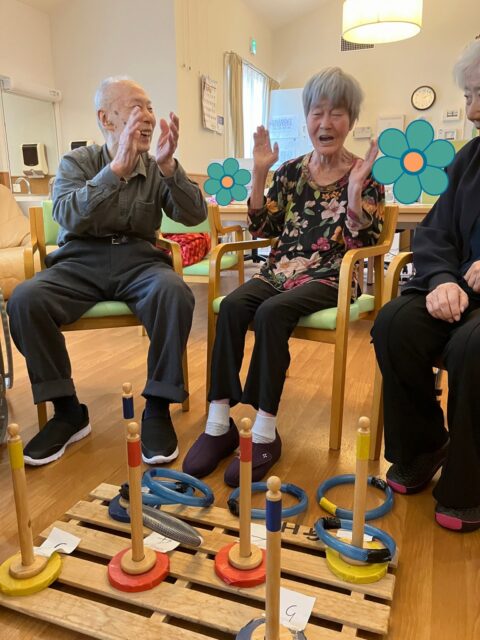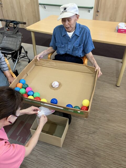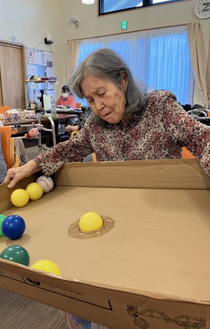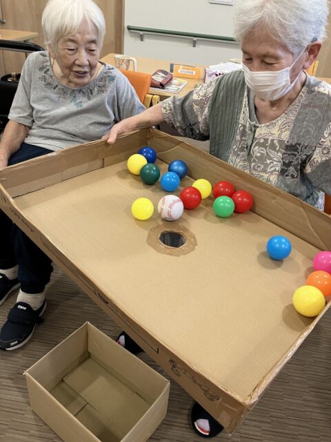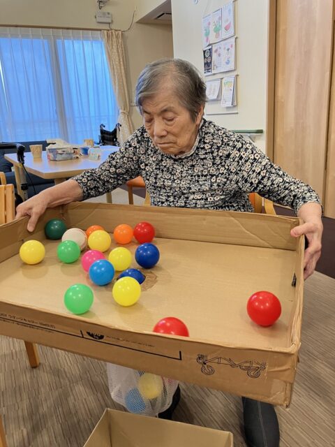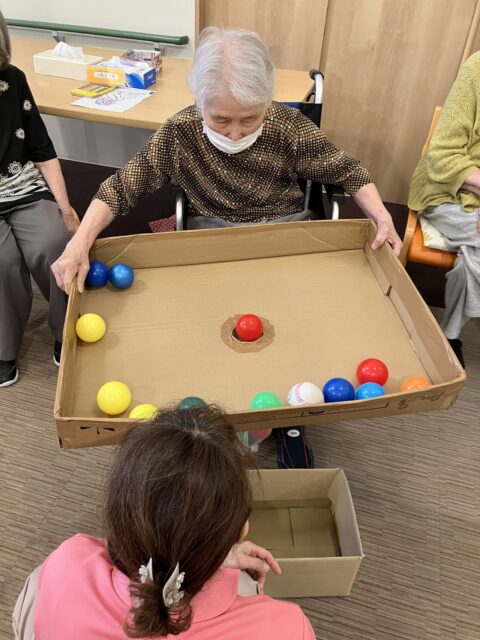 先日のレクリエーションでは、段ボールを使った「穴落としゲーム」を行いました!😊