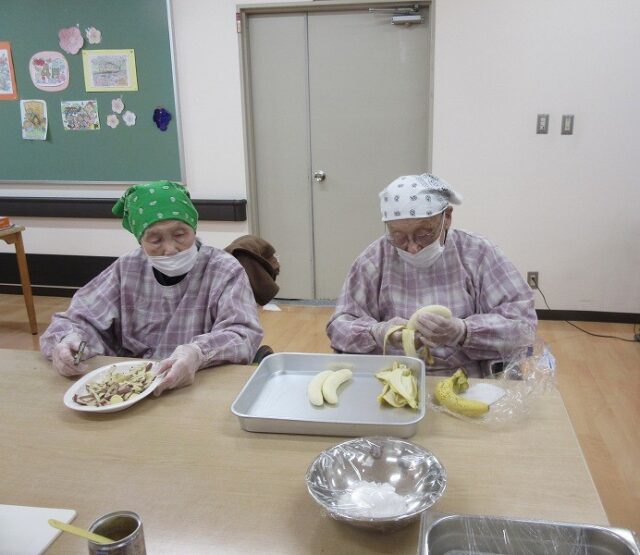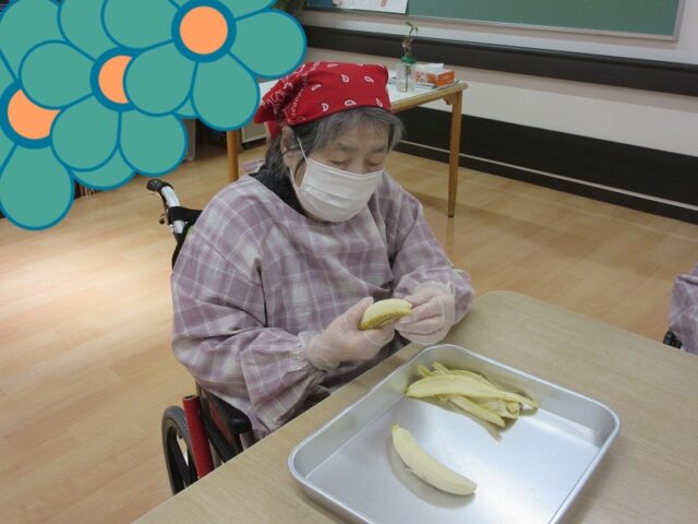 皆さんにはバナナを切る作業や各自のお皿に並べる作業をしていただきました。