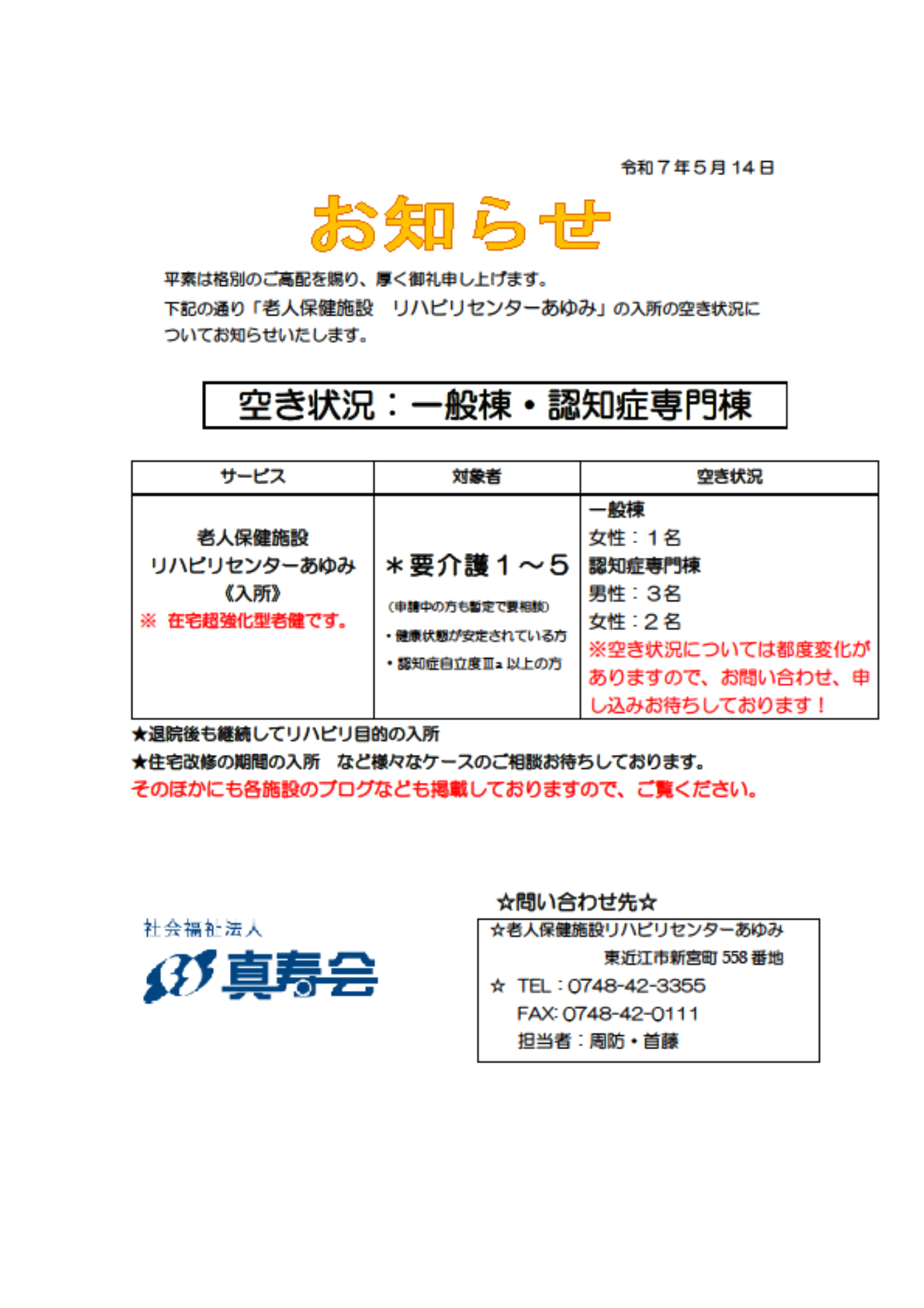 リハビリセンターあゆみ 空き状況(5月14日)