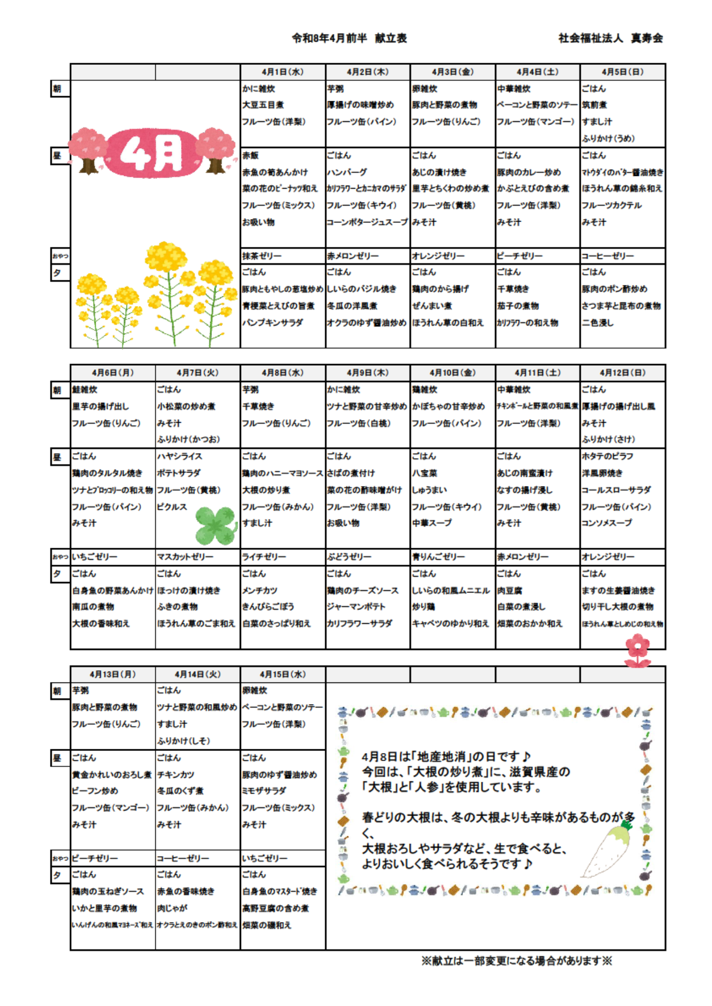 4月(1日~15日分)の献立表