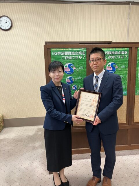 令和7年3月27日に県庁にて岸本副知事より女性活躍推進企業認定書を授与していただきました。